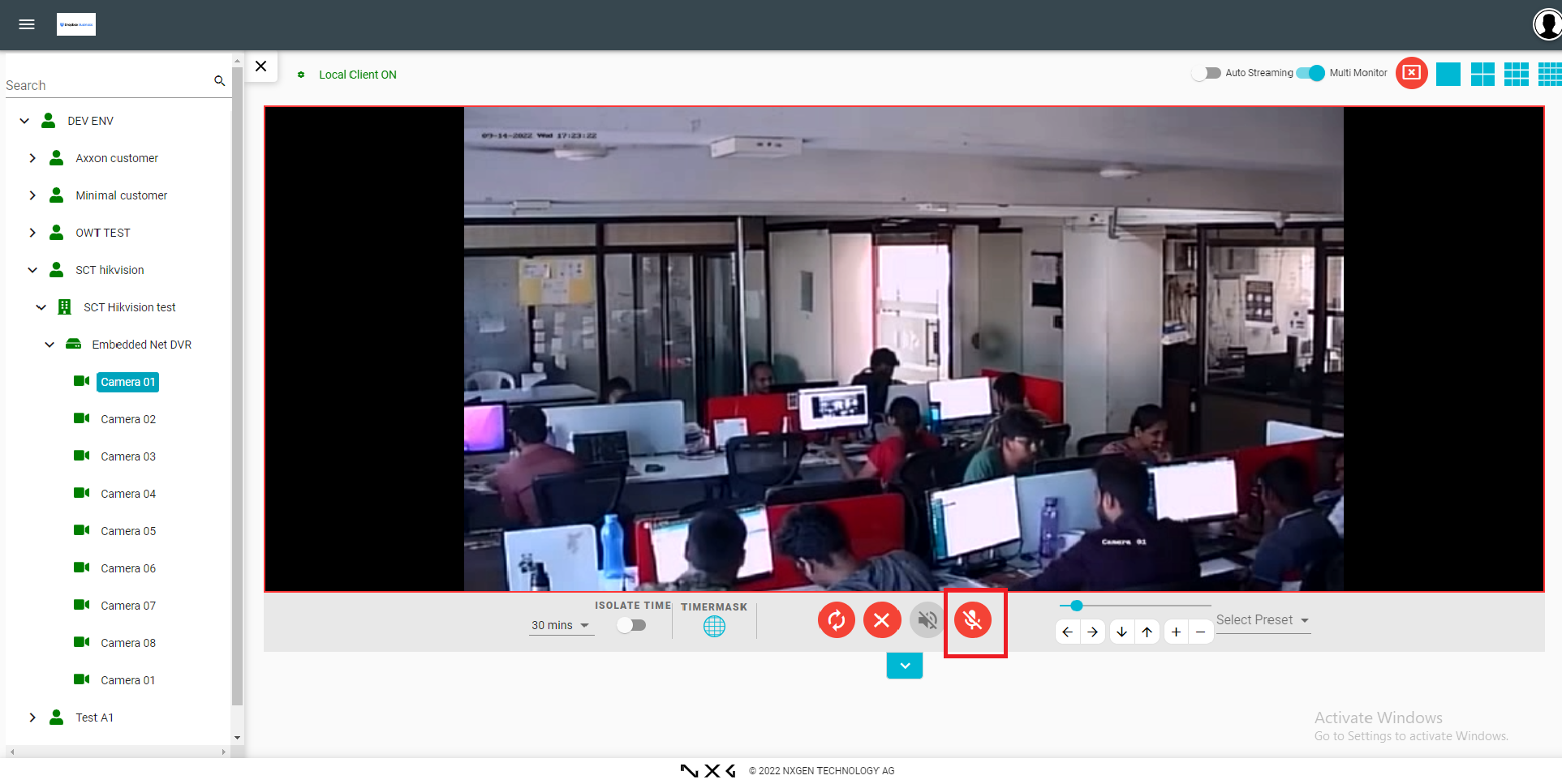Perform live stream of any camera in the site and turn on the microphone option.