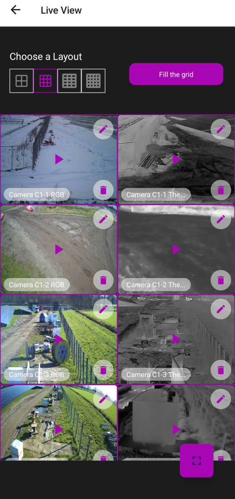 At the top of the screen, four layout options are available: 2×2, 3×3, and 4×4 grids. Select the layout that works best for the number of cameras you want to monitor. Tap Fill the Grid to automatically populate the selected layout with all available cameras at the site.